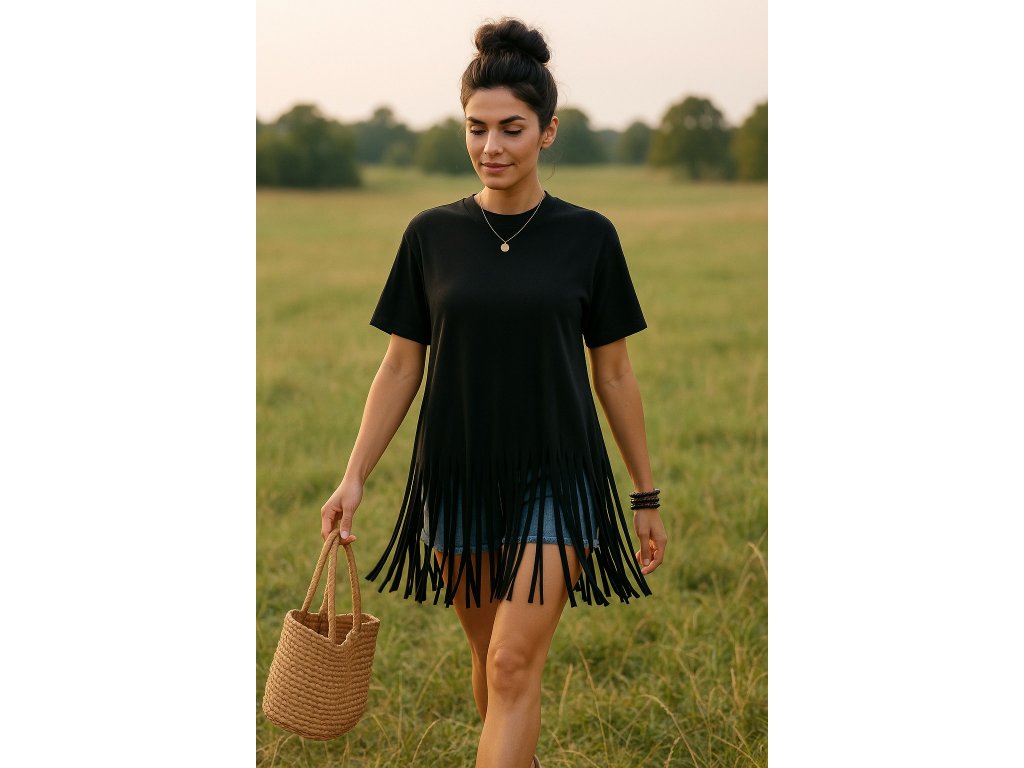Dodejte svému outfitu šmrnc s naším stylovým tričkem Fringe! Tento kousek zaujme originálním designem s třásněmi, které vytváří hravý a ležérní efekt. Díky pohodlnému střihu a příjemnému materiálu se hodí na volné dny, festivaly i letní procházky. Skvěle ladí s džínami, kraťasy i sukní , je to univerzální kousek, který oživí každý šatník.